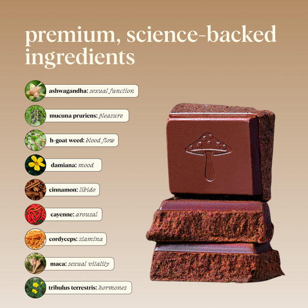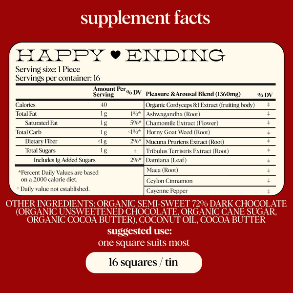 Each bite of Happy Ending is formulated to boost arousal and satisfaction in the long term while also delivering an immediate boost to pleasure and desire during intimacy.