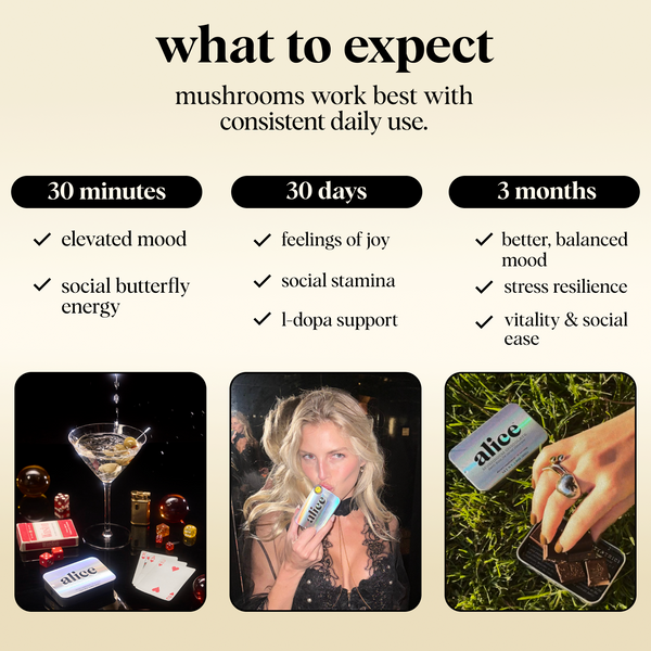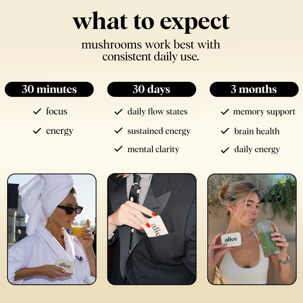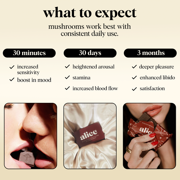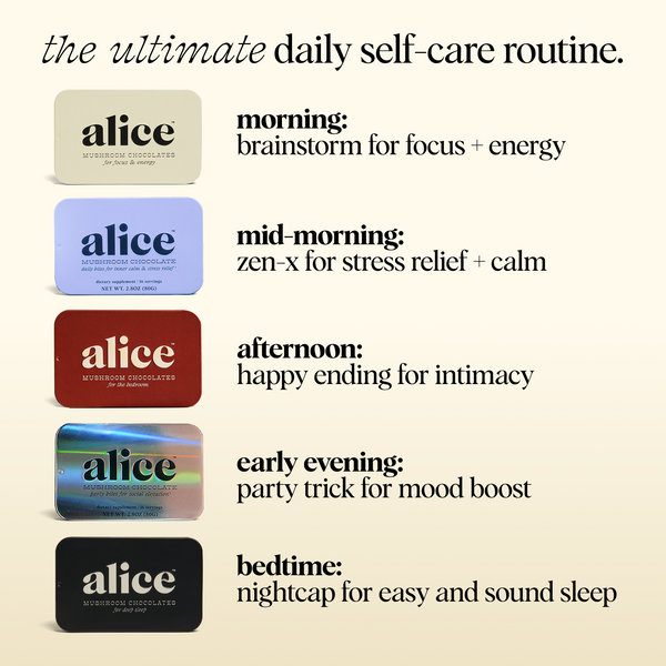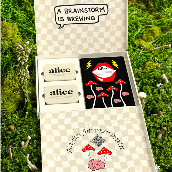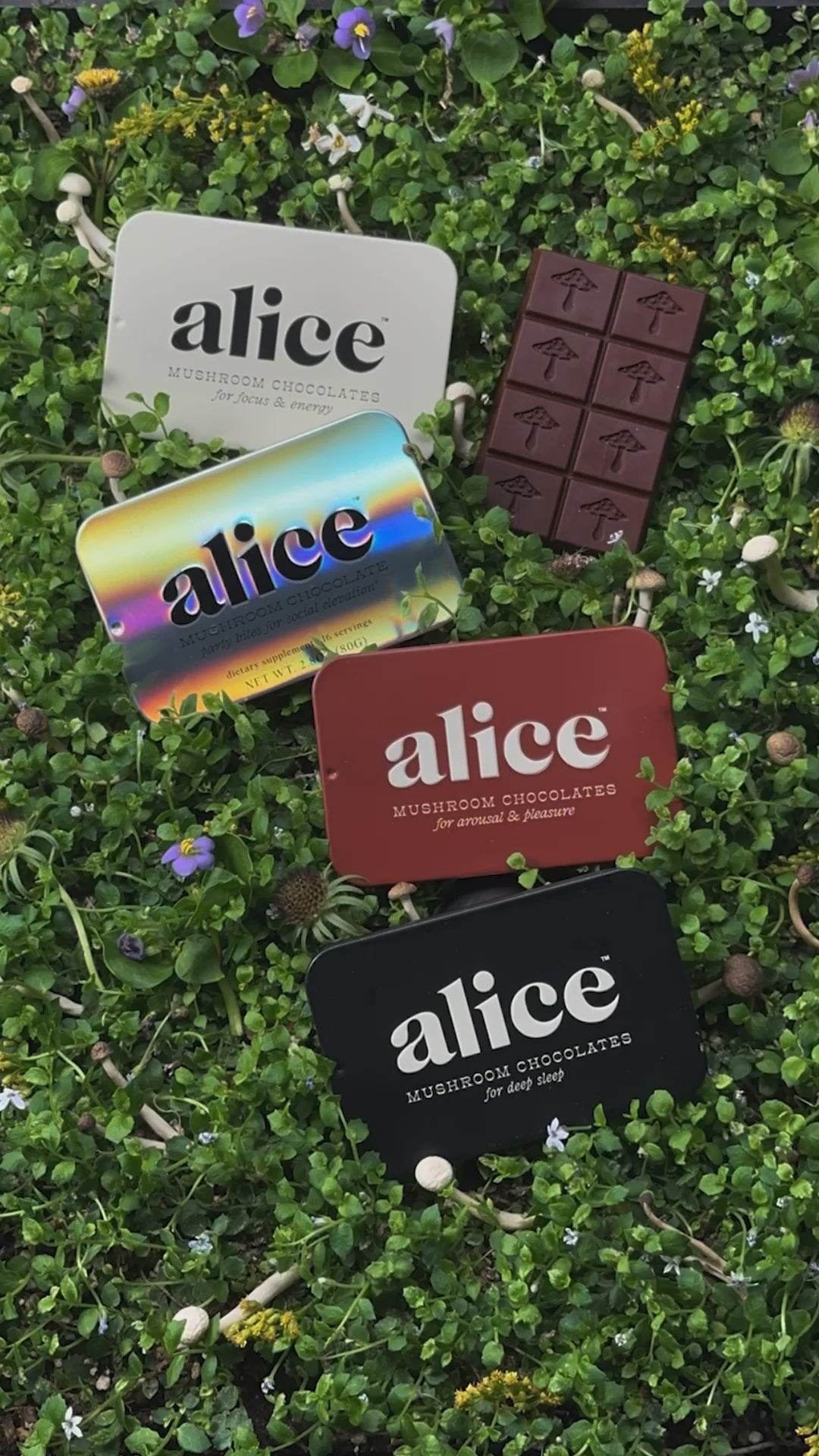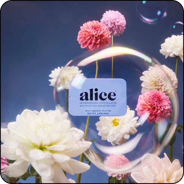We have a simple motto at alice: indulge, don’t endure. We hated spending so much money on functional mushrooms in forms that didn’t taste good and were an effort to consume — and without consistent daily use, we didn’t feel their effects either. So we set out to create a wellness routine that was actually joyful, not one we felt like we had to force down. Every bite of alice is delicious which makes it a treat to eat every day. Say goodbye to unappetizing tinctures and powders sitting half-used on your counter and say hello to a decadent daily bite of chocolate with long term benefits you can feel.