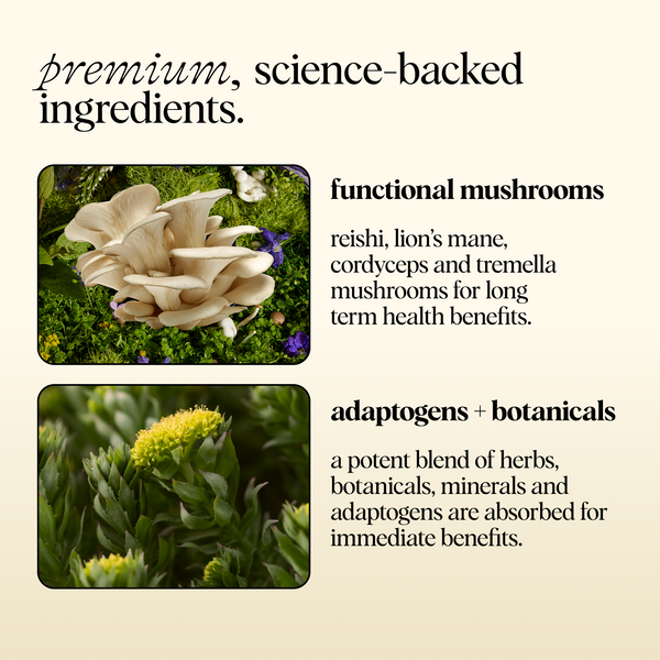 The long term benefits come from the functional mushrooms, Reishi and Tremella, which are felt over time — not instantly. Reishi contains Triterpenes that work directly with your parasympathetic nervous system to help alleviate stress, promote relaxation, and balance cortisol levels. Naturally occurring polysaccharides in Tremella nourish the body at a cellular level, promoting elasticity from the inside out. When incorporated into a daily routine, these nutrients compound in your body and become more effective (and noticeable) with sustained use.*