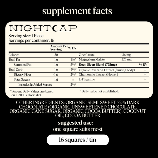 Each bite of Nightcap is formulated to regulate sleep cycles in the long-term while also delivering an immediate feeling of nighttime relaxation.