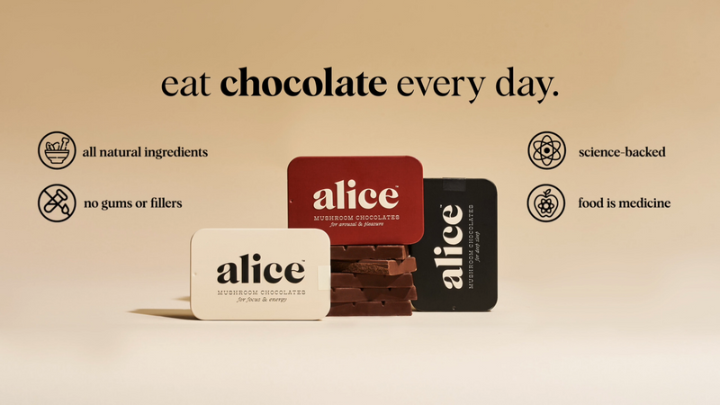 alice gives people what neither the pharmaceutical industry nor supplements have provided: safe, effective consumables that pair long-term benefits with immediate boosts to cognitive functioning. All in one chocolate bite.