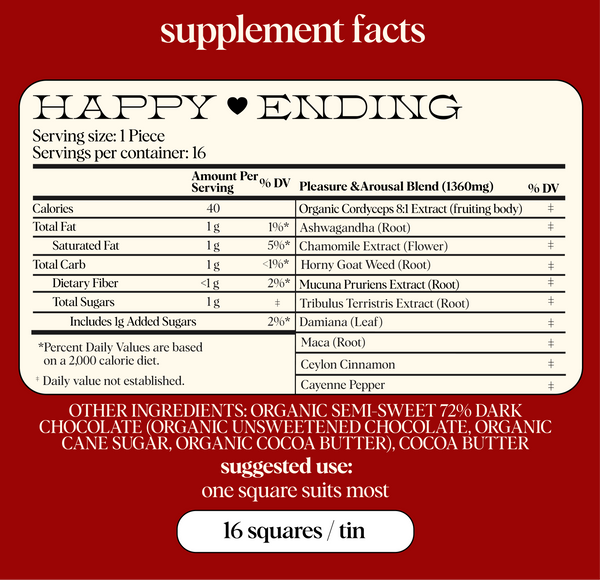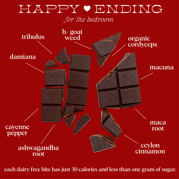 when you enjoy one square of happy ending daily, the ingredients will compound in the body over time to enhance your drive, stamina, and satisfaction.