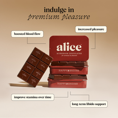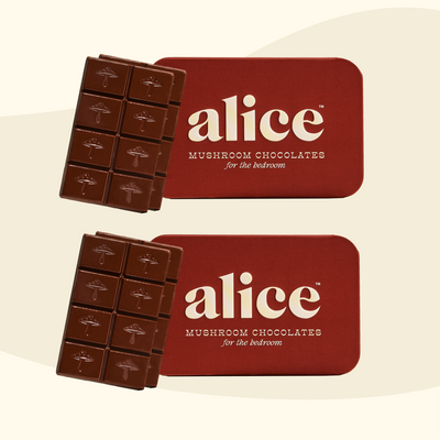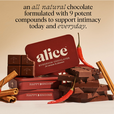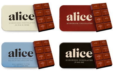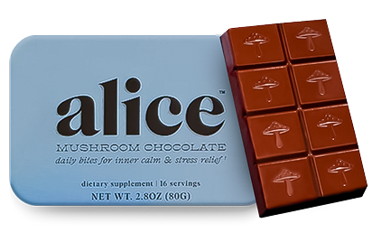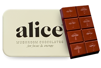 We have a simple motto at alice: indulge, don’t endure. We hated spending so much money on functional mushrooms in forms that didn’t taste good and were an effort to consume — and without consistent daily use, we didn’t feel their effects either. So we set out to create a wellness routine that was actually joyful, not one we felt like we had to force down. Every bite of alice is delicious which makes it a treat to eat every day. Say goodbye to unappetizing tinctures and powders sitting half-used on your counter and say hello to a decadent daily bite of chocolate with long term benefits you can feel.