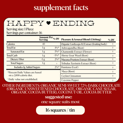 when you enjoy one square of happy ending daily, the ingredients compound in the body over time to support drive, stamina, and satisfaction.*