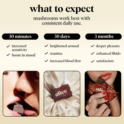 Happy Ending works best when consumed as a daily supplement for overall wellness – at any time of day, regardless of your intimate activity. You may feel some subtle effects immediately (15-45 minutes after eating a square), but nothing that would get you into trouble outside of the bedroom ;) To up the immediate effects prior to intimacy, we suggest taking an extra 1-3 squares about 15-45 minutes before the experience.