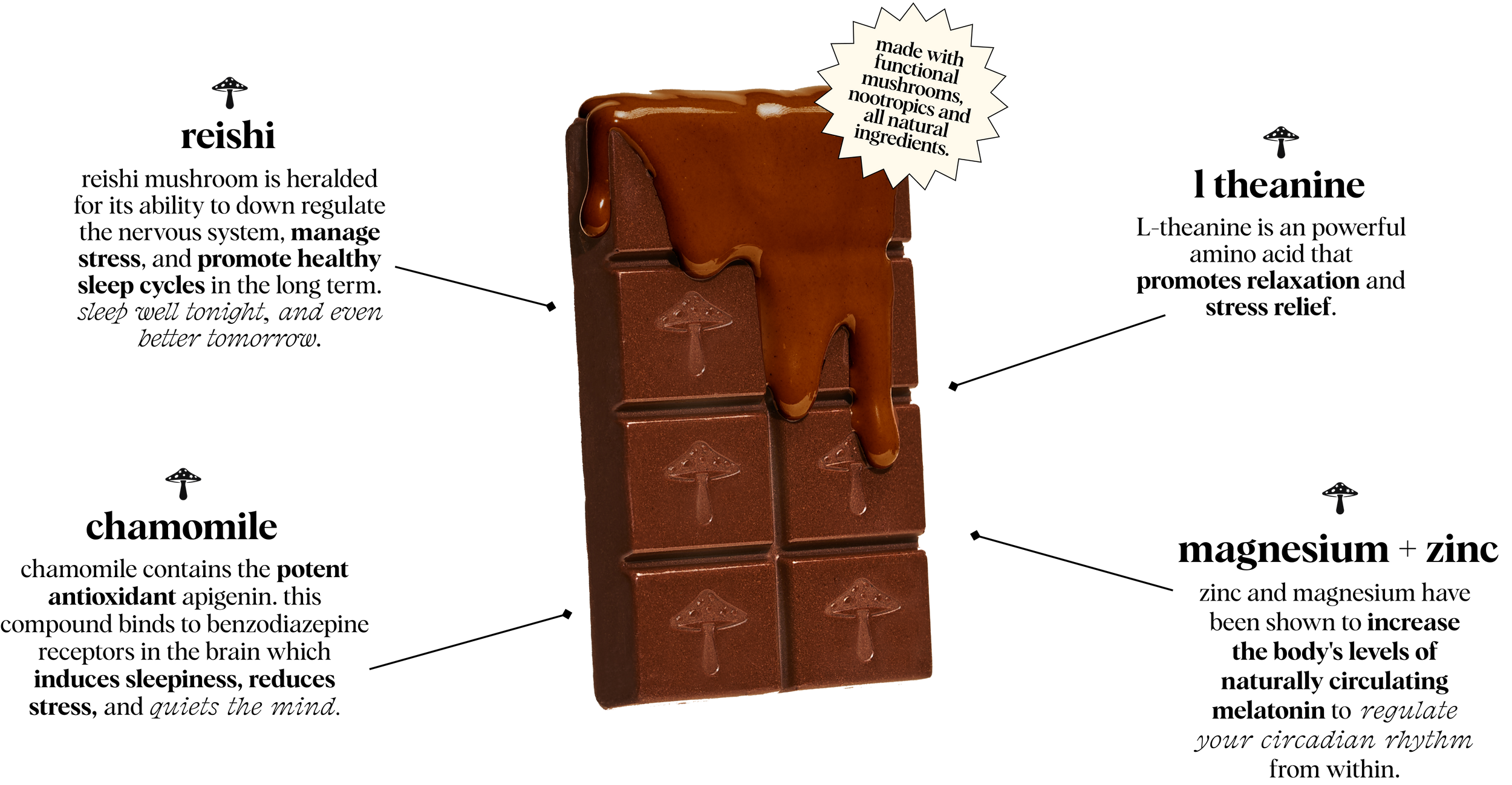 reishi mushroom is heralded for its ability to down regulate the nervous system, manage stress, and promote healthy sleep cycles in the long term. sleep well tonight, and even better tomorrow.