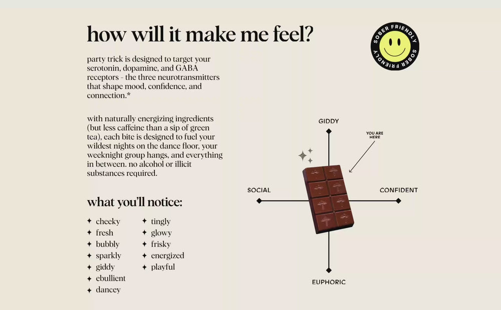 relax without the regrets. each square of party trick is formulated with l-taurine and amino acids that calm the mind while keeping you sharp.